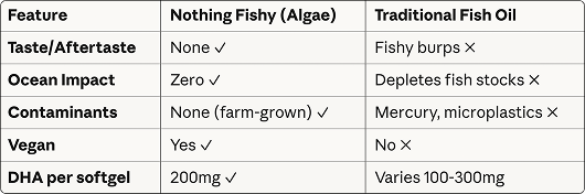 We sell directly to you, no middlemen, no markups. You get premium, algae-based omega-3s for less than leading fish oil brands.